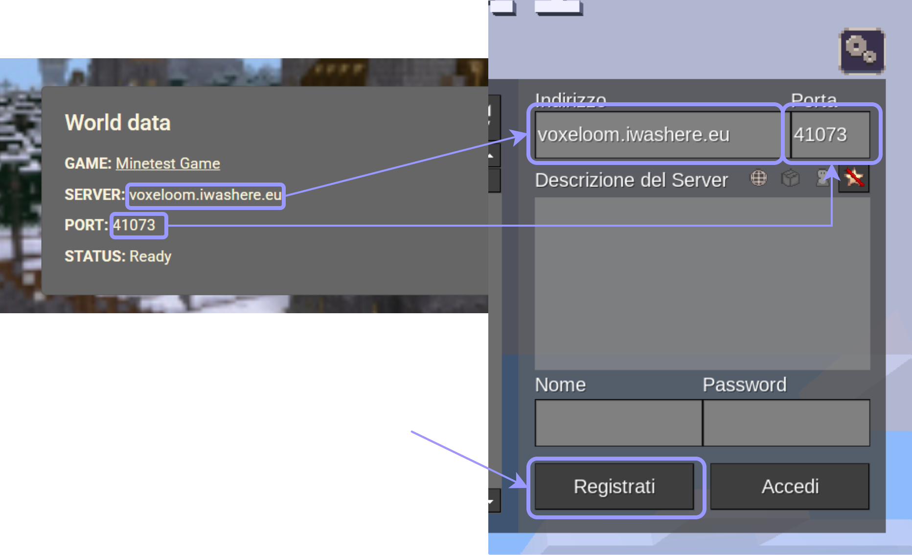 and password) and finally access the world!